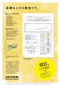小学部のチラシが完成しました(^^) 一時、小学部の人数が増えすぎて教室内の雰囲気に疑問を感じたので、チラシでの募集を一時停止して半数になるまで自然減少!?させました。 やっぱり塾って特別な場所ですから勉強に対してチャンとした考えを持った親御さんと生徒さんに集まって頂くことが基本です。塾さえ行けば勉強のことは何とかなる!なーんて考えの方にはそれなりの塾があるはずです。 ナルゼミ小学部は決して詰込み型のガリ勉教室ではありません。その子の能力を踏まえながら小学生時代に何をするべきか?!を考えて指導します。勉強はマラソンのようなもの、初めの10kmあたりで全力疾走して体力を使い果たすような指導は間違っています。その子の能力に応じた適正な集団で走れるよう伴走してあげる気持ちでなければなりません。 2010年2月から始めた[全国定期テスト]も好評です!下記に新しいナルゼミ小学部の特徴をご紹介致します。 ■ナルゼミ小学部の特徴 ・成績を上げる教室です。 ・成績上位者が集う教室です。 ・上位進学校を目指す教室です。 ・入塾テストがある教室です。 ・通塾基準がある教室です。 ・定員を守る少人数の教室です。 ・中学受験に対応する教室です。 ・先取り学習に取り組む教室です。 ・学校帰りに立ち寄れる教室です。 ・アルバイト講師がいない教室です。 ■新時間割 ・16:30-17:50 ※2010年12月6日より リンク先 *次へ *前へ *top pageへ *topics indexへ